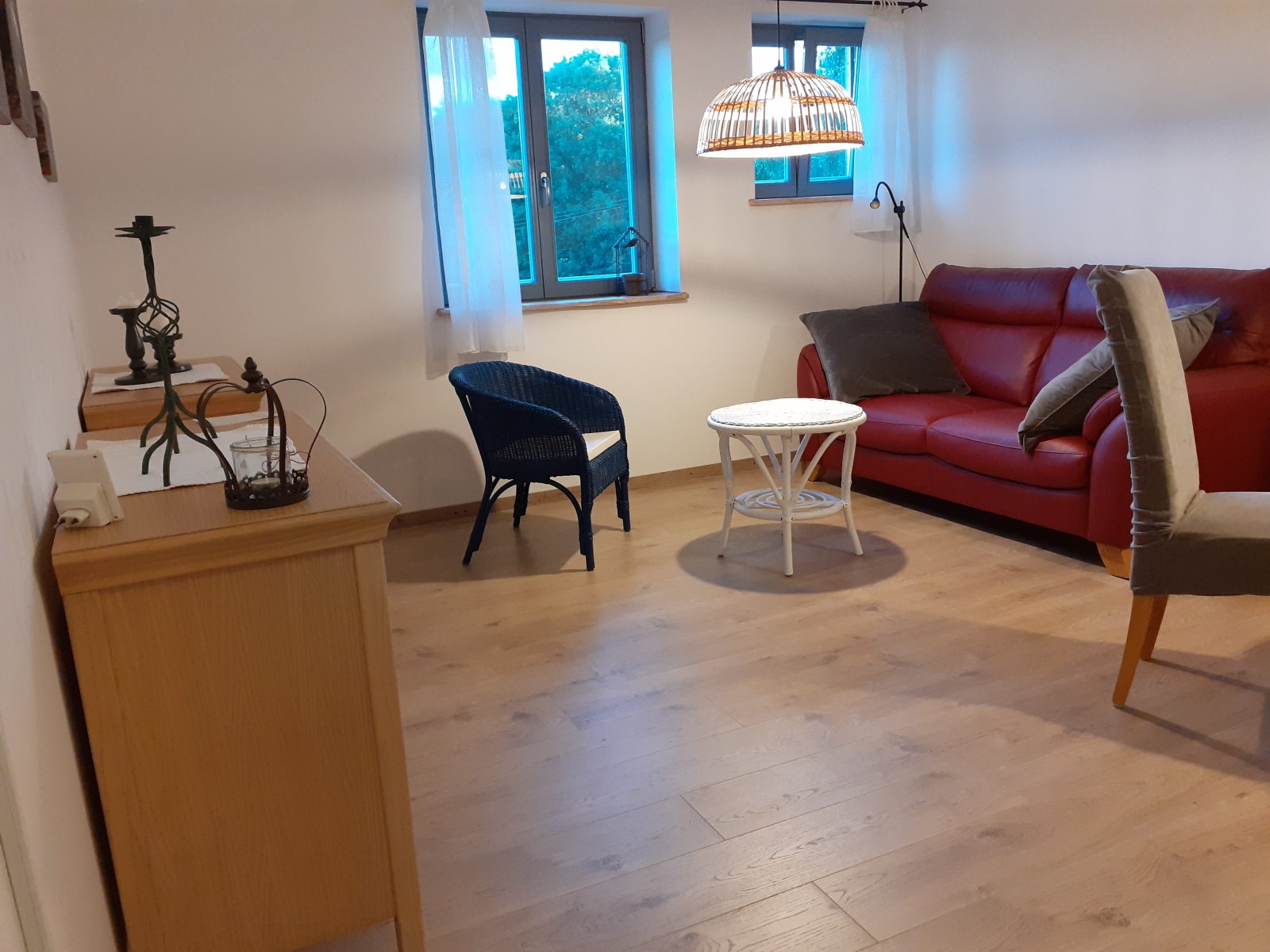 Im Wohnzimmer lädt ein rotes Ledersofa zum Verweilen ein. Im Tisch und im Sideboard finden Sie viel Stauraum. Das Bad bietet mit einer Dusche von 90×90 cm Erfrischung. Am Waschbecken ist eine Armatur mit Schlauch z.B. zum Haarewaschen. Im Schlafzimmer steht ein großes Bett von 180×200 cm. Hochwertige Matzratzen und Verdunklungsvorhänge bieten beste Möglichkeiten für einen erholsamen Schlaf.